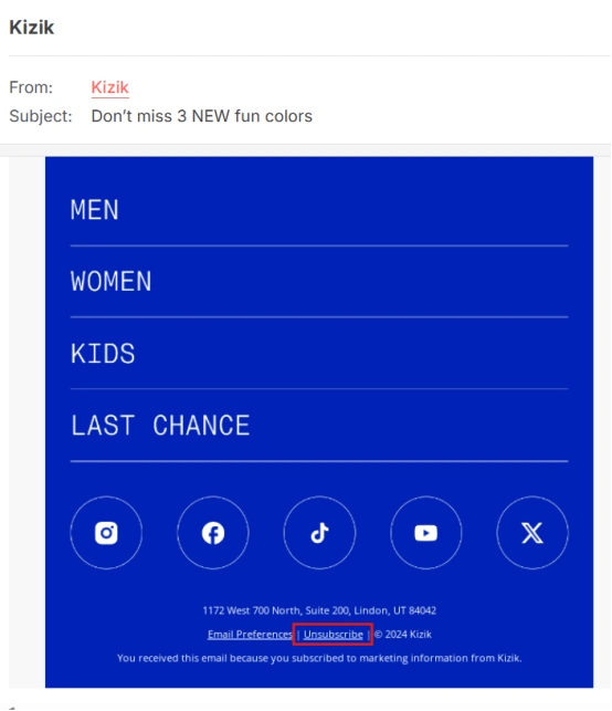 It’s often practical to include an unsubscribe button or link in the footer of your emails. Here’s an example: